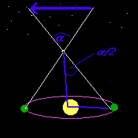 An imaginary perpendicular from the star to the sun bisects a. Since the distance between the sun and eath is known, the distance between the star and the earth can be calculated using trigonometry. This method is only accurate for fairly near stars. The angle a is actually quite small, and becomes even more difficult to measure as the distance increases. |