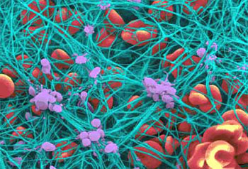occur. This is accomplished by solidification of the blood, a process called coagulation or clotting. A blood clot consists of a plug of platelets (purple) and red blood cells enmeshed (trapped) in a network of insoluble fibrin molecules (blue). |
