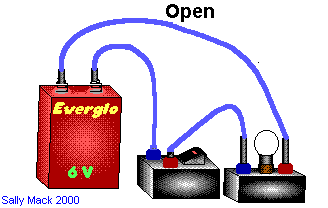 Switches can be used to control the flow of electricity in a circuit. When the switch is turned off, we say it is "open". Current cannot flow. When the switch is turned on, we say it is "closed". Current can flow. Back