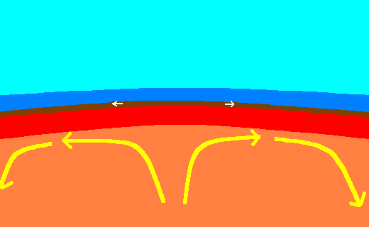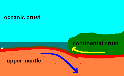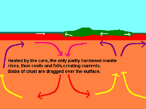 The Earth's crust may be of two types; the continental crust and the oceanic crust. These differ in thickness and composition.The two types of crust are believed to have formed as the young Earth cooled. Convectional currents in the partially molten magma are believed to drive the movement of the plates across the Earth's surface. Places where the oceanic plate plunges under the continental plate are called subduction zones. Mountain building and volcano formation occurs here. Places where plates move apart are called spreading zones. New crust is formed here. Volcanoes are also often found in these regions. Some volcanoes occur in the middle of a plates, as it passes over a "hot spot" in the mantle. Queensland's extinct volcanoes are believed to have formed this way. Some Useful Links Pages by Sally Mack 1998-2001 |